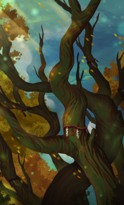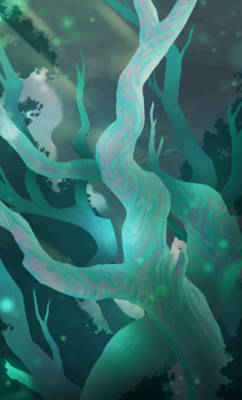 At the treetops, a faint blue light pulls at your attention. You move closer, careful but determined. As you approach, a sudden wave of sadness hits you. Tears form, and you wipe them away, unsure why the feeling is so overwhelming.