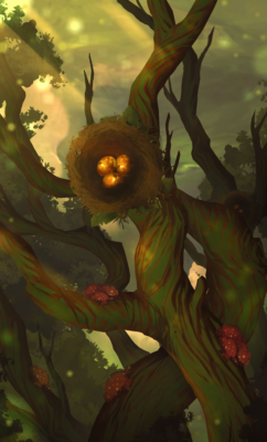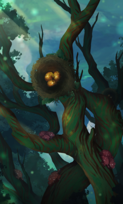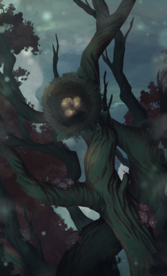 You find a nest holding a trembling golden egg. It rocks back and forth, wrong somehow. When you look at it, your chest tightens with pain. What you thought was moonlight reveals itself as a glowing path rising into the sky, the blue light traveling along it before vanishing. You want to follow, but something keeps you rooted as the egg begins to crack.