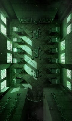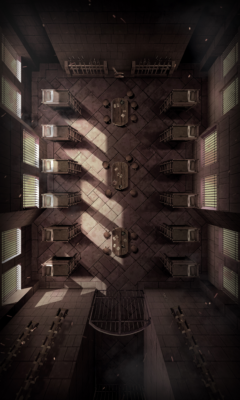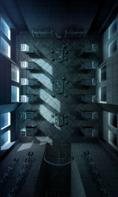 Two metal gates across a single corridor are all that lead to the wardens’ retreat. It is here wardens sleep on night duties, spend their off time playing cards, and sit at the table to discuss devilish new plots to torture inmates.