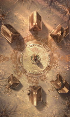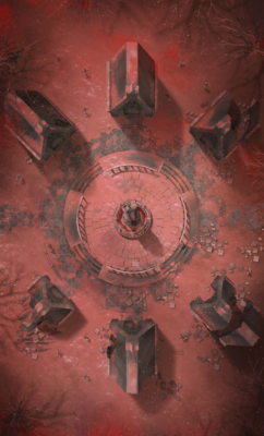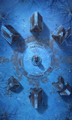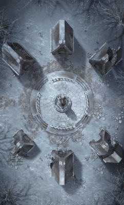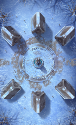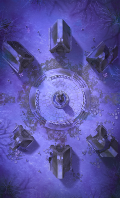 Snow blankets the cemetery in a pale hush, softening broken headstones and half-buried markers arranged in a solemn circle. At its center stands a weathered statue, worn smooth by time and frost, watching over the graves in silent vigil. The paths between the tombs are cracked and uneven, their purpose still clear, though no living feet have walked them in years.